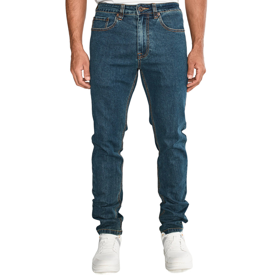 Jeans slim color navy con material Triblend 72% algodón, 27% poliéster, 1% Spandex, corte skinny semi pegado a la pierna, bragueta con cremallera y cierre de caña con la marca, diseño de 5 bolsillos; remache con logotipo en el bolsillo de la mano, parche con el logotipo de CAT en la parte trasera de la cintura, etiqueta envolvente triangular en el bolsillo trasero de parche, delgado a través de la pierna y múltiples entrepiernas disponibles.